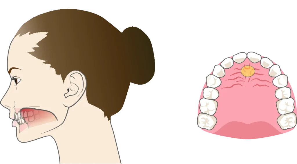 正常な舌の位置は、上あご(スポット)に軽く触れている状態です。特に成長期のお子さまの場合、口呼吸により舌が下がると、上あごの成長が不十分になったり、歯が内側に倒れてきたりします。成人の場合も、口呼吸は歯並びの安定性に影響します。